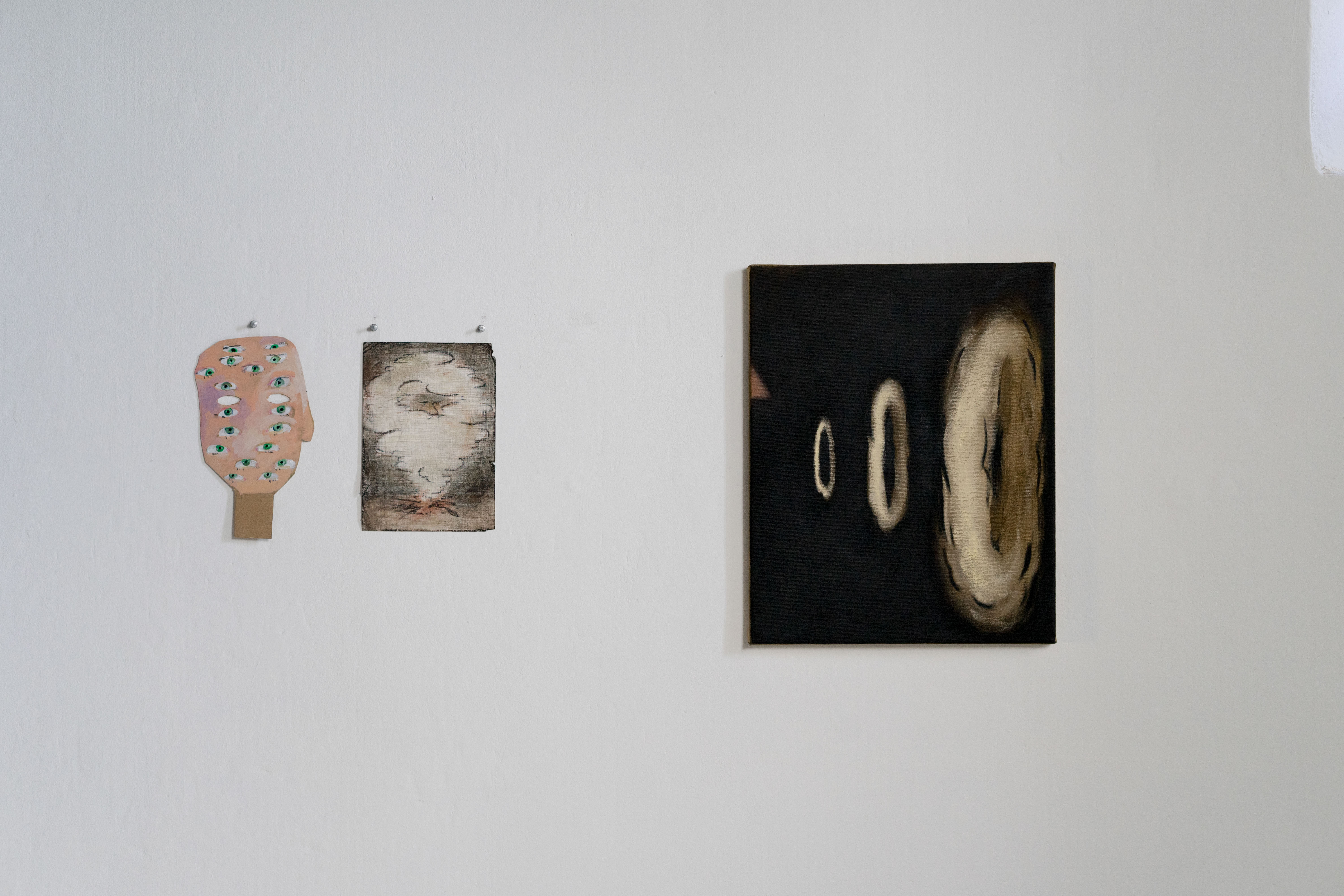 ‘Nightswimming’ During a research trip to Berlin, I picked up a book called ‘Nightswimming: Discotheques from the 1960s to the Present’, 2015, by Chiara Carpenter, Giovanna Silva and Wayne Daly. This history of dance clubs, looking at them anthropologically and as an architectural phenomenon, made me reconsider how people at clubs activate a space. I was interested in the way individuals spark connections and create dialogues, both hostile and through friendship. Individuals’ proximity within the club, the swell of mass, the singular actor as a part of a whole – these dynamics intrigued me and I wanted to recreate these interactions through artists’ work. I wanted the paintings to act similarly, to pass by each other, affect perceptions and preconceived ideas of painting. I wanted some works to be close to each other, while some works cut through the crowd looking for acquaintances. This show, like a club, inhabits the night, where questions can be asked without the light of day, where decisions can be questionable. Nightswimming - entering the dark water – uncertain, slightly afraid but open and with others close.